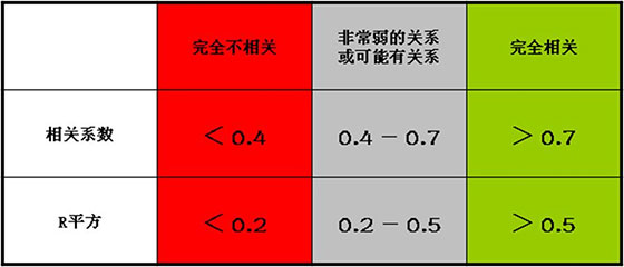 图中的R平方称为拟合系数,函数称为拟合函数,点中间的线称为拟合线,R平方越接近1表明X与Y的相关关系越明显,如果R平方=1,表明散点图中的所有点都在拟合线上。下表是R平方与相关性的关系表。