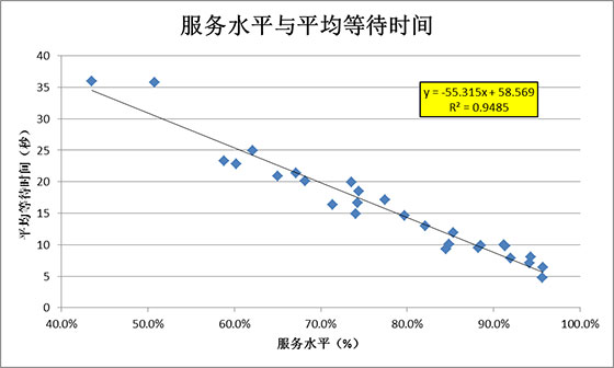 下面的这张散点图就是服务水平与平均等待时间的散点图。