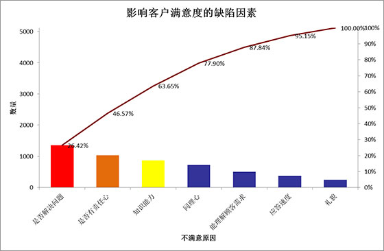 上面的这张佩瑞图中表明是否解决问题、是否有责任心和知识能力是影响客户满意度的最大的三个因素,这三个因素是改善的重点。