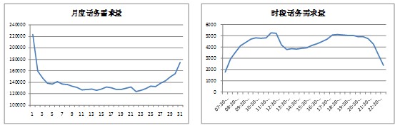 月度话务规律呈现U型,月初和月末话务需求偏高,月中话务需求偏低,主要受公司业务影响,月初为扣费、出账、开通集中日期,而月末则是扣费、停机、咨询以及取消集中日期。