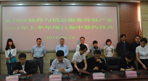 4月18日,重庆永川区人民政府在区人防应急指挥中心举行2014年上半年软件与信息服务外包产业项目集中签约仪式。华创启明、文思海辉腾讯QQ音乐等民营企业将合力把永川打造成为软件与信息服务外包产业基地。