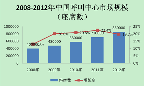 呼叫中心进入中国已有较长一段时间,从最初的通信、金融行业,目前已辐射到各行各业。截止2012年底,中国呼叫中心座席总数达到850,000个,市场累计规模为691.2亿元。