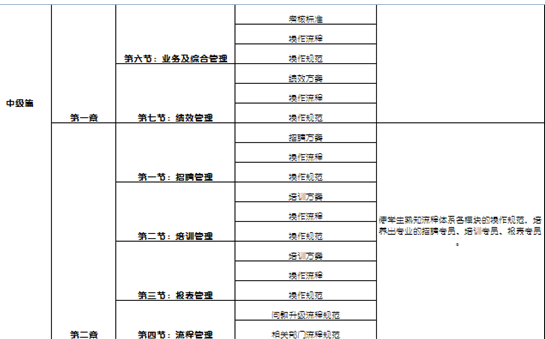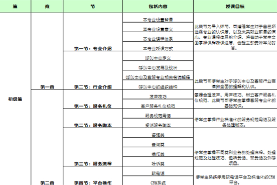 ·专业课程教育:具体又包括专业技能课和业务知识课,专业技能课程的教学体系设置可参考如下内容,分为:初级、中级和高级三个阶段,而业务知识课程则是指不同用工企业的业务知识。