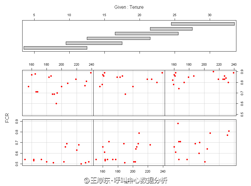 下图是一组FCR与AHT之间的关系受员工在职时长影响的探索示例,影响可能明显,也可能并不明显。