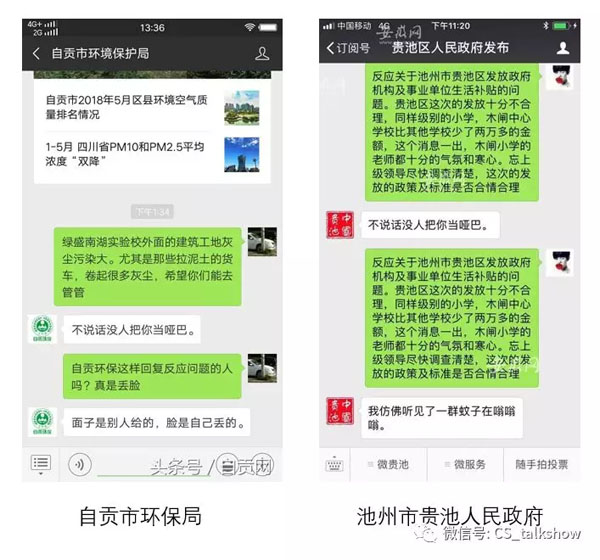 然而,时隔一个月后,再次发生政府部门的官方微信公众号在与公众交互中引入不合时宜的机器人(上图左,自贡市环保局的公众号在应对民众投诉时,小黄鸡再次出言不逊),并再次发生服务事故,则反映出政府部门在迅猛发展的移动互联时代,试图跟随潮流和满足民众需要的努力过程中显露出的问题。一方面对于互联网服务渠道的技术应用和配置所知甚少,没有一个完整的服务体系设计,另一方面,在把服务外包过程中却无法实现有效监管导致服务隐患累积并最终演变为服务事故。