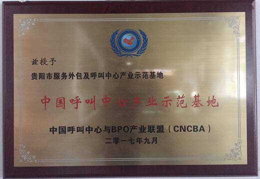 2017年9月,中国呼叫中心与BPO产业联盟(CNCBA)授予“贵阳呼叫中心与服务外包产业示范基地”为“中国呼叫中心产业示范基地”。该示范基地位于贵阳国际会议展览中心电子商业街,总面积约为33000平方米,是一个拥有3200坐席规模、行业领先、企业经营、参观展示为一体的高端呼叫中心示范基地,解决近万人就业。示范基地作为贵阳呼叫中心产业发展的标志性项目,将引领贵阳呼叫中心及服务外包产业加快发展,带动黔中经济区大数据产业联动发展。 作为贵阳大数据产业的重要载体,呼叫中心对经济发展、促进就业意义重大,是落实贵阳市委、市政府“抓两头促中间”发展思路的重要抓手,促进产业转型的重要途径,以及吸纳社会就业的重要渠道。