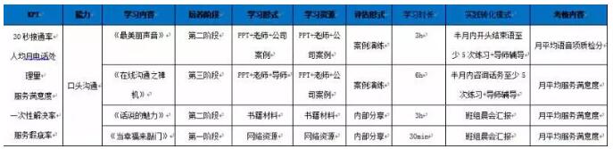 结合岗位核心能力制定每项能力所需的培训内容,再依据“721“法则制定学习形式,员工可以清晰的知道自己的学习道路是由培训,实践和分享总结三个阶段构成的,其核心内容已大大超越了课堂培训。其中含课堂学习、电子学习、阅读等学习的培训只占到整体学习的10%,在会议中分享或做讲师,可以占到学习的20%,而真正应该注重的部分是在岗位实践中学到的,占到70%。由此,员工会在自我发展过程中,更加合理的分配学习经历与学习资源。最后再根据学习内容由浅入深安排学习阶段,例如优先进行态度引导,在知识引导后再进行技能训练等。关于客服代表核心能力之一“口头沟通”的培训内容设计,请见下表2: