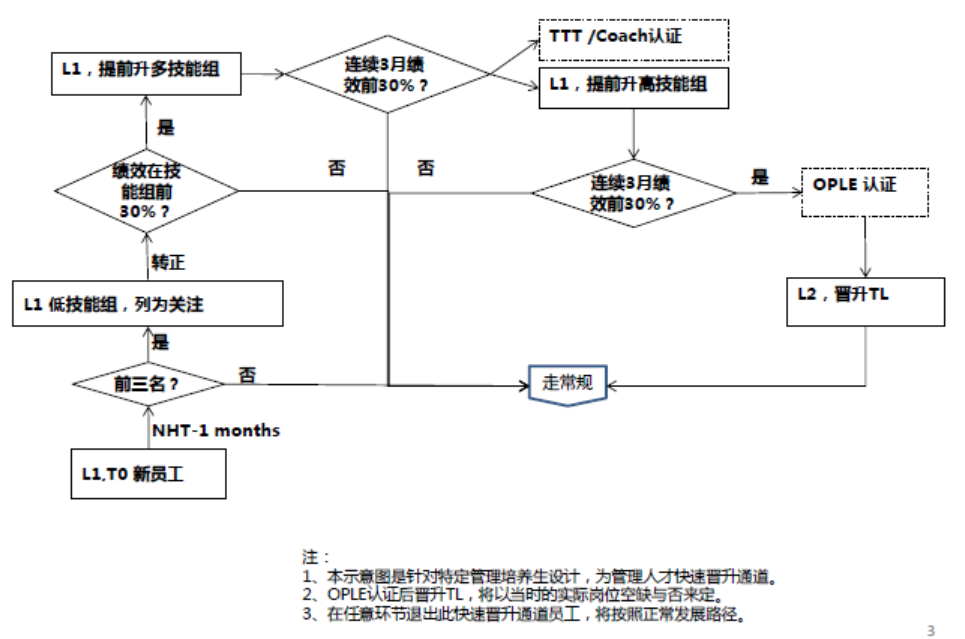 从这个计划的名字就可以知道这个方向的培养是为组织储备未来的管理人才而设置的,在我们的呼叫中心有一个称之为“OPLE”的认证项目,这个项目又称之为“潜力领导者基础培养项目”。我们通过内部人才盘点来发现组织中的潜力领导者,然后通过让他们参加“OPLE”而加速他们成为“下一代管理者”。图2是该项目的简单示意,从中可以看到对于具有潜力的优秀人才我们会为开其通特定的绿色发展通道,从而帮助这些潜力人才少走弯路,更快地成长。