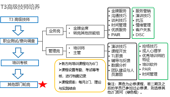 相比较管理层级的发展可以有绿色通道提供,专业职级的提升更需要依靠员工自身的积累,但是从专业培训的角度出发,我们还是可以根据岗位任职标准定义,通过设计一系列有针对性的培训来帮助其成长,图3就是对高级技师培养的示例。