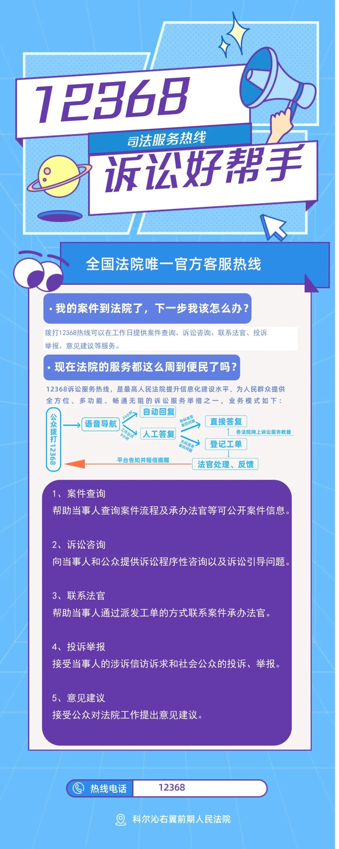 12368诉讼服务热线提供的“一号通办”服务涵盖了案件查询、诉讼咨询、意见建议、联系法官、预约服务等多项服务内容。让当事人打得通电话、找得到法官、说得清情况、等得到回复,确保问询有人查、咨询有人答、诉求有人记,及时为当事人答疑解惑和排忧解难,有效搭建起了一座群众与法院之间的贴心服务桥梁。