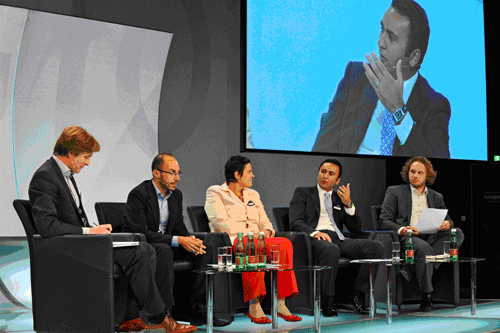 由左至右:罗马尼亚电信客服主管Jeroen Hollestelle,罗马尼亚沃达丰客服总监David Perotta,夏普CEE区企业通讯经理Karin Korschan, 土耳其TTNET电信渠道与客户关系主管Vedat Sencer Sözer,捷克T-Mobile电信客服运营副总裁Radek Šterba