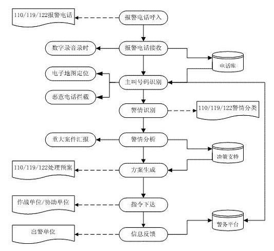 该系统主要分为电信子系统(完成联动中心与各电信公司之间话音的传输、交换和分配,以及主叫号码和主叫地址的自动查询和传输等)、接警中心子系统(统一接听和处理市民的报警、求助电话)、指挥调度子系统(或称为处警中心,通过直观的地理信息系统和数据库,可以对所有的资源和警力分布了如指掌。通过一体化的无线数据传输和无线调度台进行方便的统一管理,指挥和调度)、信息网络子系统(联动中心的骨干网络,把各种数据数库、接处警席位、移动的警用车载计算机等互联在一起,形成一个强大的信息网络)、无线指挥调度通信子系统、大屏幕显示子系统、地理信息子系统、GPS/GIS子系统。