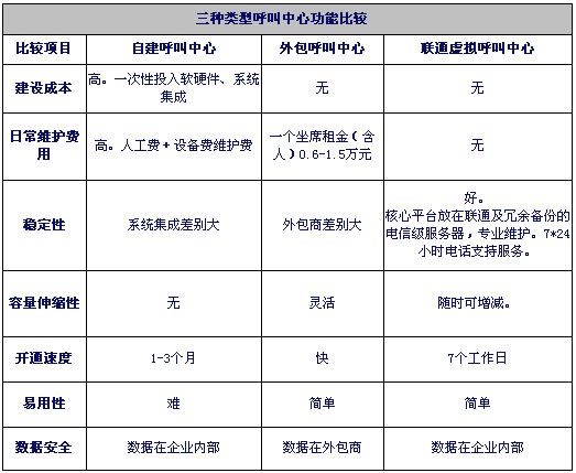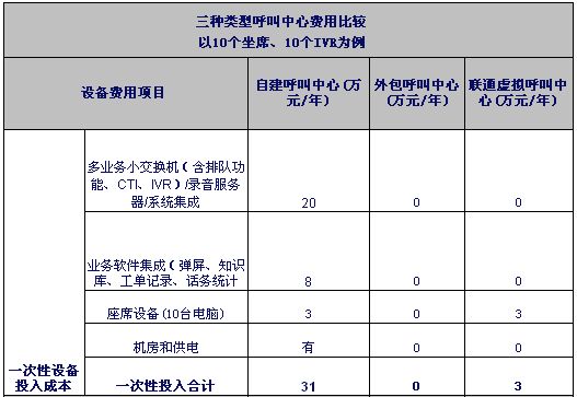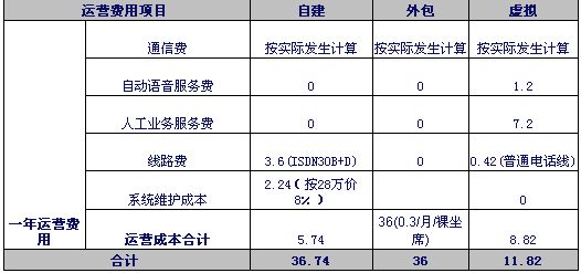 注1:自建和外包呼叫中心按目前市场平均价计算。虚拟呼叫中心按联通标准资费计算。外包坐席按裸坐席计算。