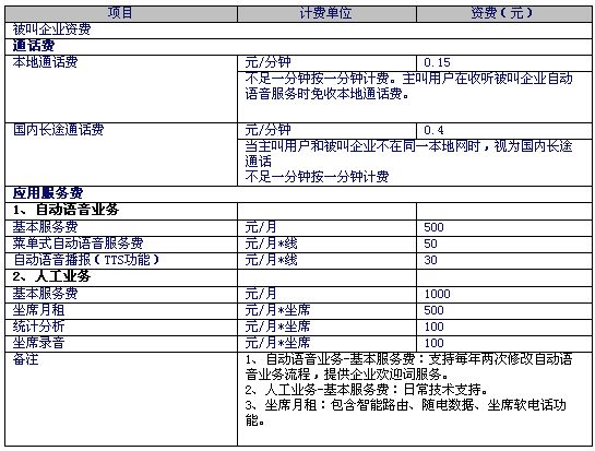 2、被叫企业资费标准如下:
