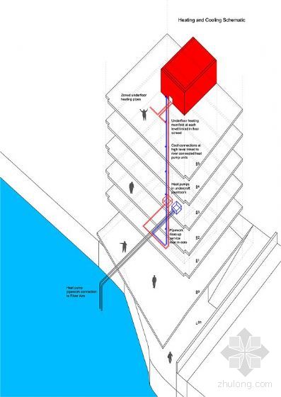 室内有一个很大的玻璃箱子结构,以此容纳各种功能需求。它围合了一层层的地板,而没有影响外表皮的形式。最后,建筑的物理系统和海水有关联,水管位于海水中,利用海水,通过热交换器、泵,提供一个可持续的加热和冷却系统。