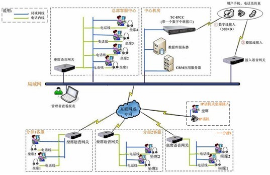 由于瑞臣涉及到的是遍及全国的营养屋,因此采用的方式是分布式坐席方案,因此全胜呼叫中心解决方案采用IPCC解决方案,IPCC方案适合广大用户使用,性价比高、稳定性好、升级扩容方便且不会造成升级前的设备浪费、兼容性好(满足与所有业务系统、数据库等接口,并融为一体!拓扑图如下: