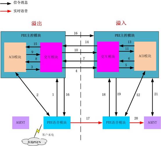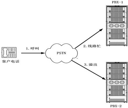 通过PBX/ACD建立一种电话路由共享和语音溢出的方法,实现多套联络中心平台之间语音的动态互溢,透明地为客户提供优质、及时的电话服务,客户感觉不到任何差异。通过PBX/ACD建立一种电话路由共享和语音溢出的方法,作为行业现有实现方法的有效补充,解决了行业现有实现方法的无法实现最短路径溢出问题,通过ACD的“先排队后进门”的预约预定模式,动态判断彼此的运行状态和处理能力,无需先将语音溢出到另外一个联络中心,只有当另外一个联络中心确定能提供相应的语音服务和人工服务的时候,语音才在PBX语音层面通过标准通信协议进行互联互通,避免实时语音被多次溢出,实时实时语音溢出只走最短路径,保证客户电话只需一次溢出就能立即提供语音服务和人工服务,大幅减少了语音溢出的处理时间,同时也大幅减少了语音处理次数,提升了系统处理性能。
