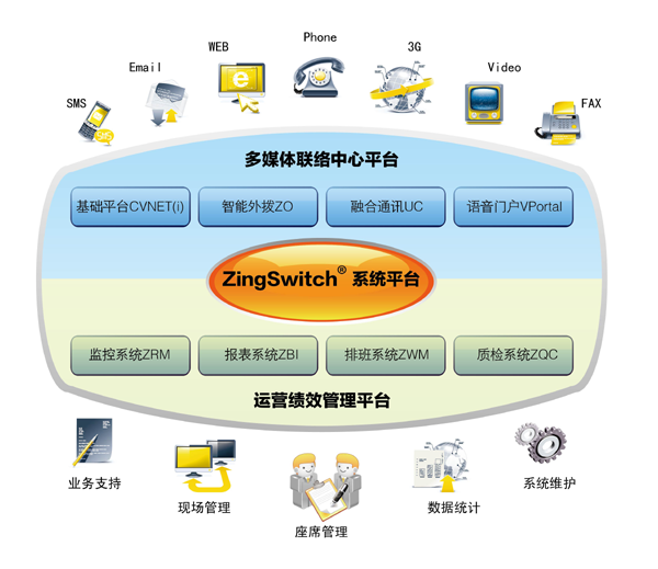 ZingFramework®CVNET全媒体联络中心平台基于H.323和SIP等国际标准协议,通过SOA服务架构实现联络中心的优化计算,以CTI技术为核心融合语音通讯技术、语音处理技术、Internet技术、IP网络通信技术、商业智能技术与企业业务系统紧密结合在一起,将通讯系统、计算机处理系统、网络通讯技术、人工业务代表、信息资源平台等整合成统一、高效的服务工作平台。通过多渠道的联络平台为客户提供的服务,集中在一个统一的对外联系"窗口",采用统一的标准服务界面,为用户提供多样化、系统化、智能化、人性化的服务。