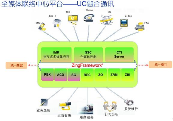 英立讯公司ZingFramework®全媒体联络中心平台基于H.323和SIP等国际标准协议,通过SOA服务架构实现联络中心的优化计算,为客户应用提供了多媒体服务处理能力,支持固话、手机、传真、邮件、短信、互联网和Web电话等多种通信方式的接入,以及3G视频互动和RFID物联应用,实现多种服务媒体和通讯渠道的统一融合,并提供统一接入、统一路由、统一排队、统一服务、统一处理和回复的的综合融合通讯服务平台。