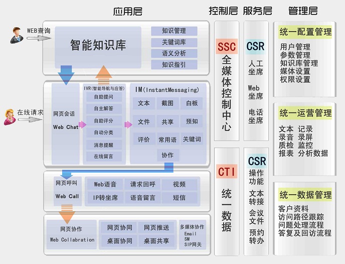 实现全媒体联络渠道的统一接入、统一排队、统一路由分配,集中管控、统一数据管理、应用接口呈现;