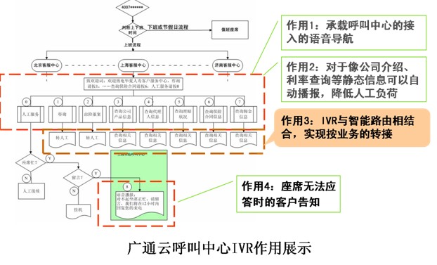 广通云呼叫中心的IVR能够根据客户的需求自由发挥,同时也能够迎合企业不同时期的业务重点和策略。当客户来电时,会有各式各样不同的需求,智能的IVR策略根据来电者所有可能的需求,并且用最短的路径去实现;另外,当企业的当前的业务发生变动或者有新的促销广告时,通过TTS(文本转换语音)功能可灵活设置的IVR语音服务,保证企业能够把最想告诉客户的信息放在IVR最前面。