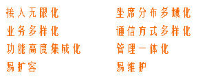 协同调度指挥业务、智能企业总机、电子电话薄、协同应急会议、语音信箱、FAX、Web呼叫、IP长途等业务应用。