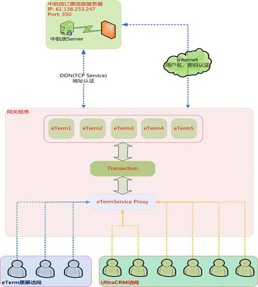 航空订票呼叫中心由CallThink-M多媒体呼叫中心平台、Eterm代理服务器 和UltraCRM 航空订票应用业务系统组成。