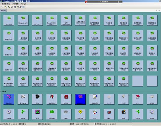 在本系统中TalenTel –DDS调度系统配备了五个调度操作台,各自的电话接入号码为1、2、3、5、6,并且还有一个热线接入号码9。实现来话显示、来话接答、多方会议、来话转接、强插、强拆、VoIP、电话跟随、呼叫状态监控、呼叫保留/取回等功能、组群呼叫功能、呼叫转接功能、单键拨号等。并且根据电厂的业务特点,有针对性地实现以下功能: