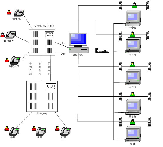 3.调度主机与MD110交换机共处一个机房,E1中继采用75欧的同轴电缆连接;