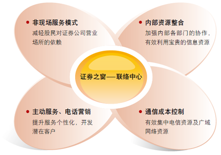随着国民经济的发展,证券成为投资理财的热点。相对于发达国家,我国的证券市场还有很大发展空间,随着金融政策的完善,指数期货、融资融券、集合理财等新型投资理财产品的推出,为证券市场的长久发展提供了广阔的空间。电话委托、可视电话委托、网上交易、传真服务、声讯服务、成交回报,以及个性化服务等业务和交易模式成为证券公司提升服务能力和客户满意度的必要手段。现代化的联络中心为证券公司提供了很好的手段。