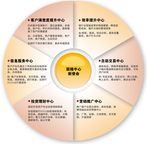 对于银行业来说,联络中心已经成为为客户提供优质、快捷的金融理财服务的第二窗口。随着电子化建设的不断深入,宽带、Internet和3G时代带来的IP融合,联络中心为金融服务带来了更广泛的创新,未来的银行联络中心将为客户提供的金融服务趋于无所不能。银行联络中心已经成为自助交易中心、投资理财中心、营销推广中心和信息服务中心,借助联络中心,银行与客户可以随时随地建立紧密的多媒体互动,提升客户满意度和服务效率。