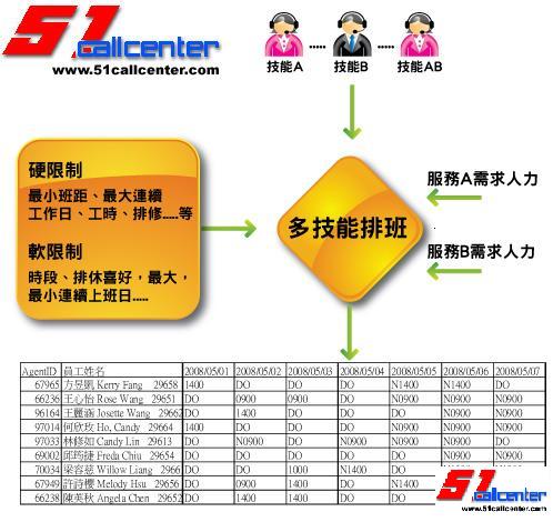 在实施人资优化软件之后,呼叫中心即可开始对各服务人力作"量"与"质"的管理,确定资源做最佳运用,如下图所示:
