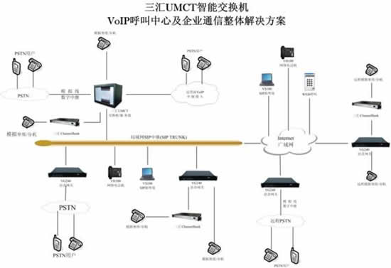 采用三汇UMCT交换机系统构建的分布式呼叫中心系统,具有先进的语音处理和强大的信令处理能力,同时可以处理来自PSTN和Internet的语音呼叫,三汇UMCT交换机支持ISDN、SS7、H.323、SIP等信令,用户在构建整个呼叫中心系统中,无需再挂接其他类型的通讯设备,就可以满足全部的呼叫中心功能,包括IVR、FAX 会议、录音等功能,系统可以采用,统一接入,分布处理的模式,大大提升了呼叫中心本身的扩展性,三汇UMCT交换系统硬件模块支持热插拔功能,在呼叫中心系统维护.调试等方面很强适应性,为分布式呼叫中心建设,提供了更多灵活的空间。