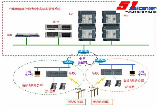 中华保险呼叫中心系统于2009年7月开始逐批上线,截止2010-1-21,除新疆外全国21家分公司呼叫中心已全部实现省集中。中华保险呼叫中心采用IP分布式架构,总公司由一套S8730媒体服务器,4个G650组成2个PN,外加一台CMS报表服务器组成。各地分支机构采用G450网关通过中华保险内部数据专用网络与总公司核心管理系统交互。其中省级B类分公司为60数字中继线接入,48坐席。省级A类分公司为30路数字中继接入,24坐席。各公司坐席采用AVAYA2410D数字话机,可以提供丰富的呼叫中心话机功能,方便坐席人员使用。