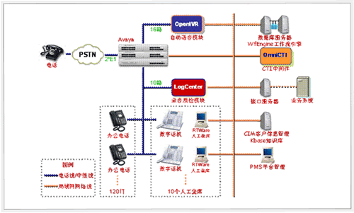 通过数字中继线(绑定新的用户服务号85771111)接入客户电话,既可以通过人工坐席向用户提供人工服务,又可以通过自动语音向用户提供交互式的自动服务,向用户提供7×24小时客户服务,同时可以接受网站受理的用户报修投诉信息;PBX同时作为120门办公电话的电话交换机,以确立武汉广电网络公司的整体服务形象.
