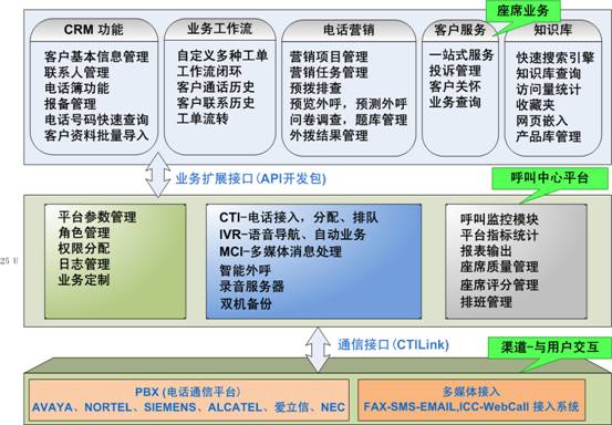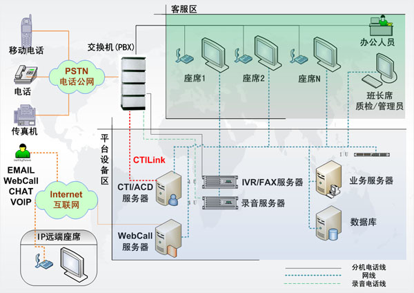包含了排队机、CTI服务器、IVR/FAX服务器、录音监控、智能外呼、工作流、报表统计系统,CRM业务集成等。