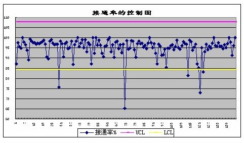 从上图可以看出,该呼叫中心的接通率基本上处于受控状态,但是曾在109-133这个时段内接通率曾一度失控。控制图是监控系统性因素造成的质量波动,预防不合格情况发生的有效工具,可以判断呼叫中心服务过程是否稳定,分析呼叫中心某些KPI的质量状态,及时处理失控现象。