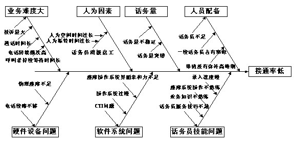 在制作因果图时,要集思广益,由表及里、追本溯源,确定主要原因,并到现场作调查,再制定解决措施。因果图是进行呼叫中心质量管理的一个有效工具,下面以分析呼叫中心的接通率低为例说如何进行因果图分析。