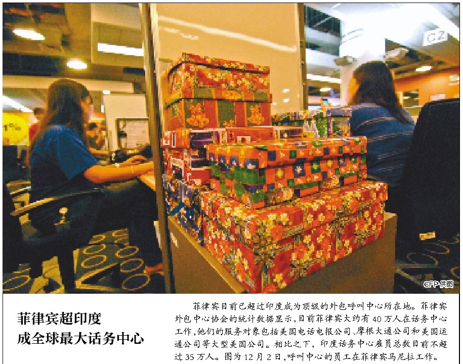 菲律宾目前已超过印度成为顶级的外包呼叫中心所在地。菲律宾外包中心协会的统计数据显示,目前菲律宾大约有40万人在话务中心工作,他们的服务对象包括美国电话电报公司、摩根大通公司和美国运通公司等大型美国公司。相比之下,印度话务中心雇员总数目前不超过35万人。图为12月2日,呼叫中心的员工在菲律宾马尼拉工作。