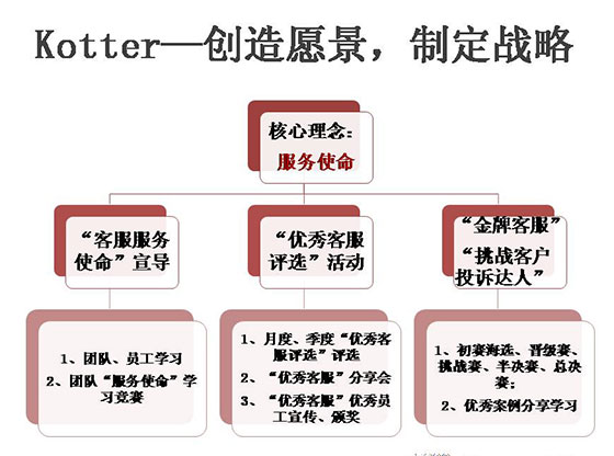 Callceter的最高管理层要创造新愿景来领导变革,例如针对呼叫中心的发展策略和要求,制定我们的“客户服务使命”(核心理念),并制定详细的战略来实现该愿景。例如将今年定为“优质服务年”,并制定一系列的活动来宣导。活动可以包括三部分: