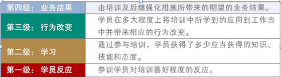 内部兼职讲师实施培训后,除日常的培训满意度评价外,训后主要通过员工训后行为改进来完成评估,促进学员行为转化,提升员工培训感知。在实际工作中可以运用科学评估工具——柯氏四级培训评估模式进行分析总结,该理论通过四个维度来跟进总结培训效果,分别从员工的满意程度、知识技能及态度行为方式的转变、工作中行为的改进、员工获得的工作成绩等方面来分析总结。具体来说,在以往注重培训满意度的基础上,再结合训后测试、日常拨测、现场工作表现和训前训后员工工作指标对比等多维度综合考核内部兼职讲师的培训效果。同时建立兼职讲师积分制度,通过每年更新培训积分来对内部兼职讲师进行排名和优胜劣汰。(柯氏四级培训评估模型见下图表)