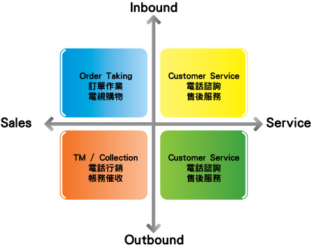 - 外拨销售 (Outbound Sales) :电话营销、帐务催收、TM / Collection