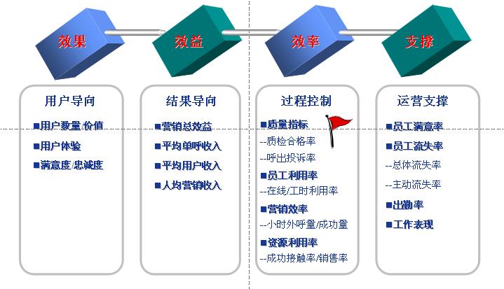 呼叫中心的业务模式中,电话营销是利润中心的定位,本着这样的定位,绩效管理则非常重要。与呼入服务的绩效管理不同,从“效果”、“效益”、“效率”、“支撑”四个主脉络,搭建如下全局脉络,共享。