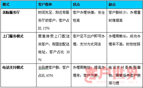 电话支付模式的应用,可为客户提供一体化的推荐、购买、支付全套服务,拓展多维立体化的市场空间,满足客户价值化服务需求。通过电话渠道(10086)购买我公司产品,不仅给客户带来真正的便捷,大大节省往来服务厅的宝贵时间,更为我公司的客户服务和客户保有提供了助推器,热线渠道借助与客户的接触机会,直接开展在线业务推荐和办理,较亲临服务厅、上门服务模式更能让客户接受。