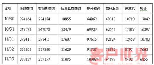 不同话务类型在不同日期的访问量不相同。表2列出10月30日至11月3日呼叫中心某子系统常用功能菜单节点的访问记录。从表中可以看出:余额查询、有效期查询、积分查询这几个菜单节点增加的访问量特别多。