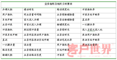 对IVR节点和业务的评价,需要有统一定义的IVR评价指标。可以从节点,业务和通话三个角度建立IVR的指标体系。通过这些指标可以对现有的IVR语音菜单及业务进行全面的评价,并提出改进的措施。以下从业务角度列出部分业务指标及相关分析要素,不同的指标面向不同的人员使用。
