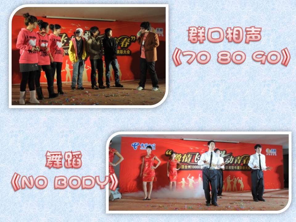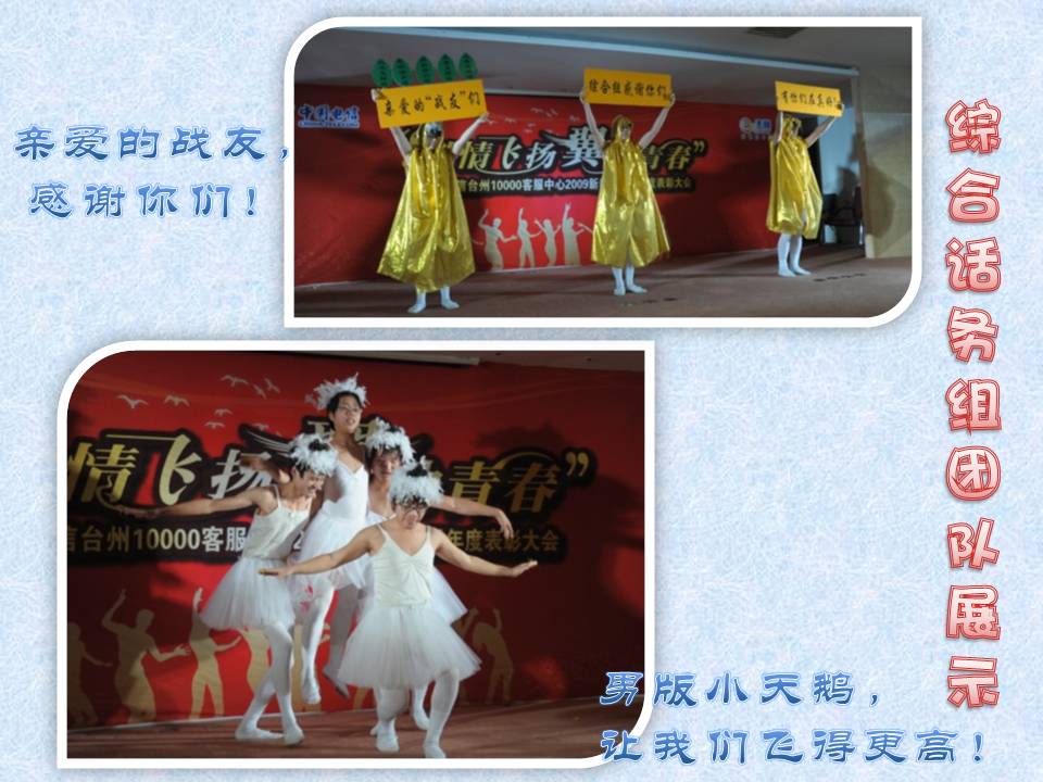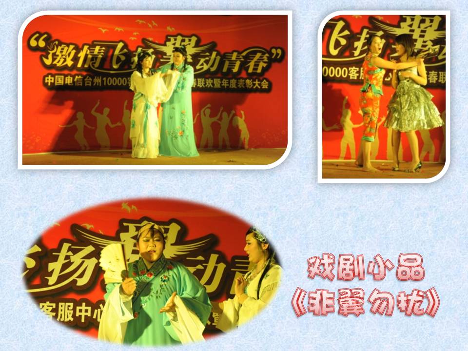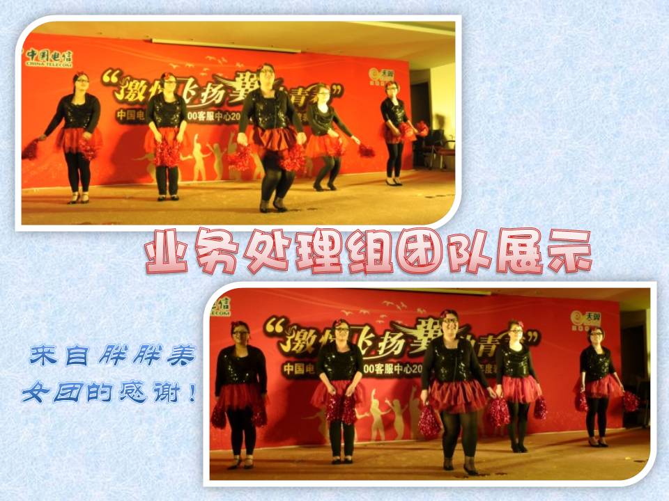 由来自10000号客服中心4大团队(综合话务组、营销维系组、业务处理组、支撑团队)精心排练、自编自演的文艺节目博来现场观众和嘉宾的阵阵掌声。