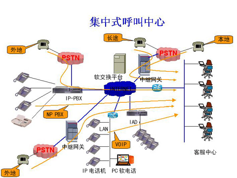 当前呼叫中心主要分为集中式呼叫中心、分布式呼叫中心。集中式呼叫中心就是为企业建立一个独立的呼叫中心,所有客服人员全部集中在一个地方,统一管理,受理客服的对象可以是本地、全省、全国或全球区域。集中式呼叫中心的组网方案可以通过软交换平台,也可以通过 PBX平台 ,也可以通过软交换平台和 PBX 的结合来实现。便于管理和统一对外形象。
