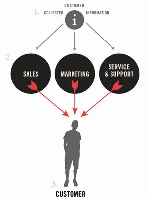 传统CRM是将公司搜集到的消费者有关信息输入到CRM系统中,通过销售、市场推广以及产品服务等措施,借此有可能获得更多的潜在目标消费者。