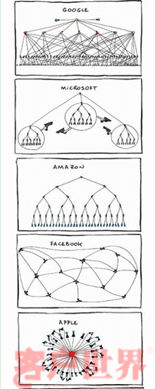 前段时间新浪微博上有张图(见图1)在IT圈子里传得风生水起,非常传神地描绘了一些美国高科技企业的组织架构图。我们可以看到几家口碑特别好(从客户体验的角度出发)的企业,比如Google,比如Apple,比如Amazon,他们都有非常强大、以CEO为核心的管理层,而这些鼎鼎有名的管理层,包括拉里•佩奇 (Larry Page)、塞吉•布林 (Sergey Brin)、史蒂夫•乔布斯(Steve Jobs)、杰夫•贝佐斯(Jeff Bezos)等人,无一不是非常尊重用户、强调客户体验的偏执狂,他们的很多故事有口皆碑,比如关于ipad2的“Wife said no,Apple said yes”的感人举动,或者杰夫•贝佐斯一直宣称的“亚马逊要做全球最以客户为中心的企业”,把消费者、商家和开发者三者全部纳入客户体验管理体系的高瞻远瞩。